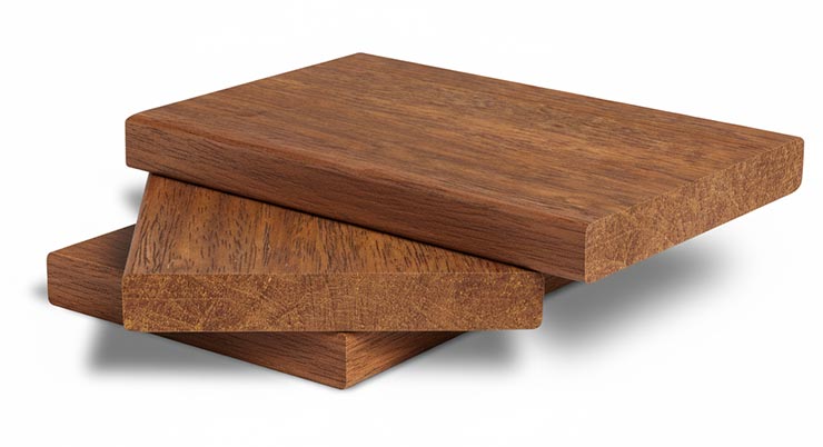 Bois exotique classe 4, brun orangé, imputrescible, stabilité optimale 25-30 ans.